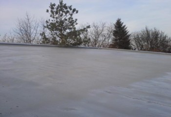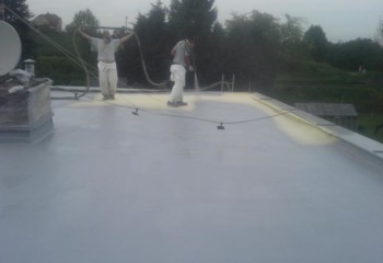 - Polyuretanová pěna tvrdne během několika sekund po nanesení na střešní plášť. Po nástřiku izolační pěny na požadovanou sílu a po provedení povrchových úprav, je nutné aplikovat ochrannou vysoce odolnou Polyureu. Tato ochranná vrstva vytvoří trvanlivý povrch odolný povětrnostním vlivům, po němž lze bez problémů chodit. Životnost takto vytvořené střechy se rovná živnotnosti stavby.