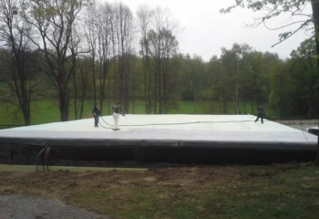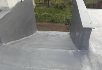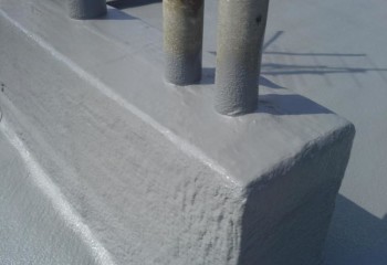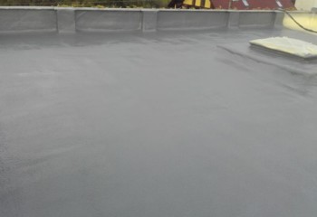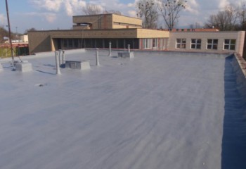 - Technologií plošného nástřiku se za předepsaných podmínek vytváří bezespará, vodotěsná a zároveň tepelně izolační vrstva. Nástřik plynule přechází z horizontální na všechny navazující vertikální plochy – atiky, boky světlíků, komínky atd. Dochází k dokonalému zatěsnění všech kritických míst – průchody vzduchotechniky, hrdla svodů atd.