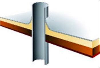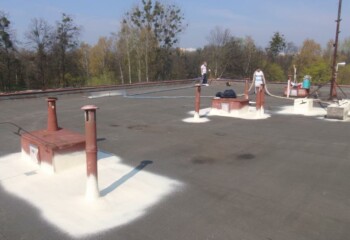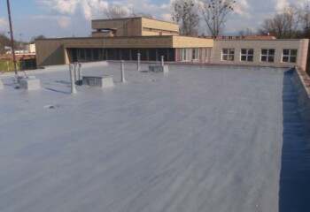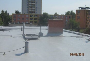 - Technologií plošného nástřiku se za předepsaných podmínek vytváří bezespará, vodotěsná a zároveň tepelně izolační vrstva. Nástřik plynule přechází z horizontální na všechny navazující vertikální plochy – atiky, boky světlíků, komínky atd. Dochází k dokonalému zatěsnění všech kritických míst – průchody vzduchotechniky, hrdla svodů atd.